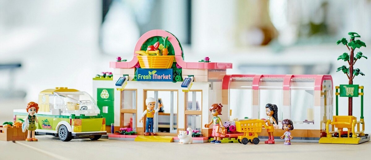Zapoznaj małych wielbicieli odgrywania ról ze światem budowania LEGO® dzięki zestawowi LEGO® Friends Sklep spożywczy z żywnością ekologiczną (41729).