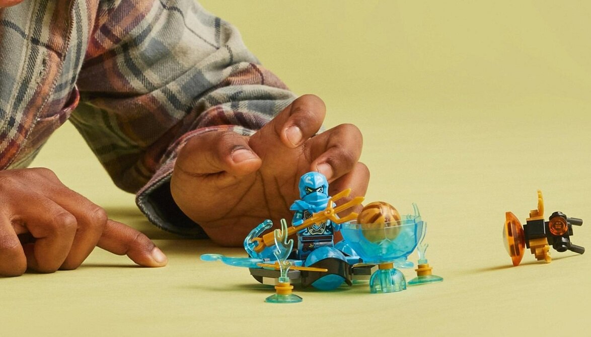 Dzieci mogą umieścić Nyę ze smoczą mocą w spinnerze ozdobionym trzema wyjątkowymi smoczymi elementami mocy, popchnąć go do przodu i obserwować, jak driftuje. Jej zadaniem jest omijanie przeszkód wodnych, pokonanie droida imperialnego trzymającego kostur i wydobycie elementu rdzenia energii złotego smoka z misy. Jest też element mocy niebieskiego smoka, a dzieci mogą zebrać jeszcze cztery pozostałe w różnych kolorach w innych zestawach NINJAGO®.