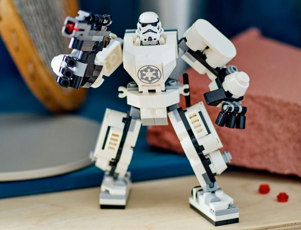 Ten mech do zbudowania ma ruchome ręce, ramiona, nogi i stopy, otwierany kokpit na minifigurkę, duży blaster strzelający klockami i klips na blaster minifigurki LEGO® szturmowca. Mech do zbudowania ma 12 cm wysokości i w przerwach w zabawie będzie stanowił świetną ozdobę.