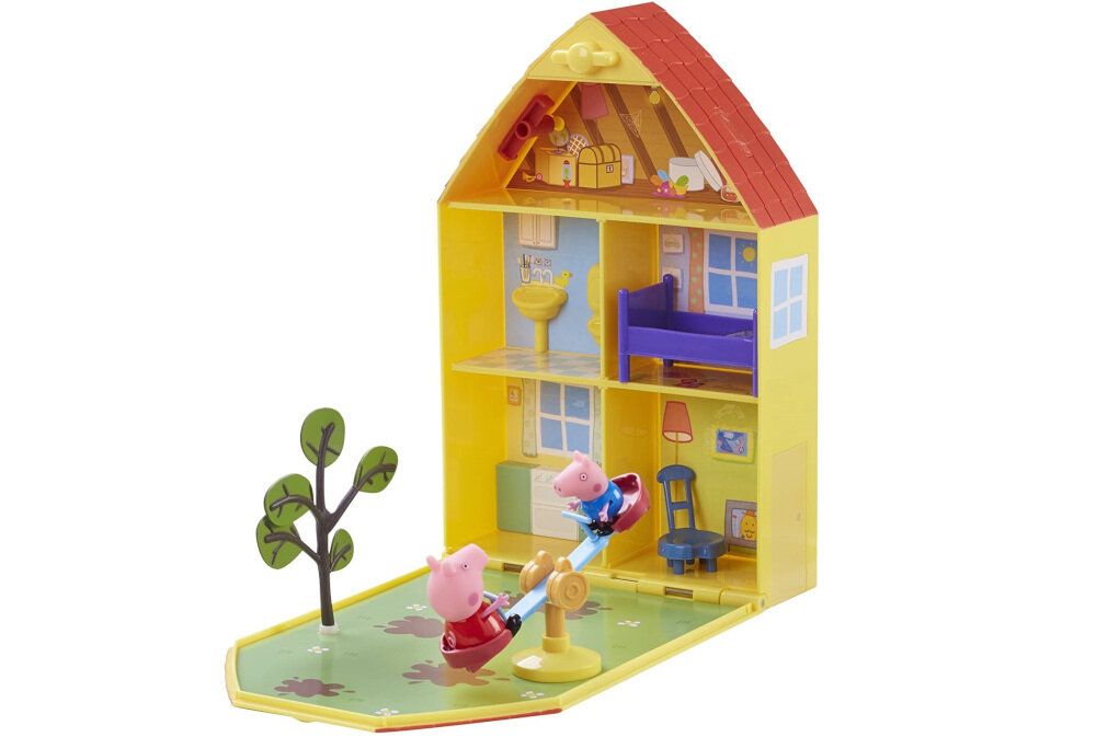 Duży, bogato wyposażony i rozkładany domek świnki Peppy to wspaniała gratka dla wszystkich wielbicieli serialu. Po rozłożeniu są do dyspozycji 2 piętra i poddasze. Na parterze jest kuchnia z wyposażeniem, a obok salon z telewizorem. Na piętrze znajduje się sypialnia Peppy z łóżkiem, a obok jest łazienka z umywalką i toaletą, ale najfajniejsza zabawa odbywa się na poddaszu. Przed domem znajduje się drzewo, a przy nim dająca dużo zabawy huśtawka.