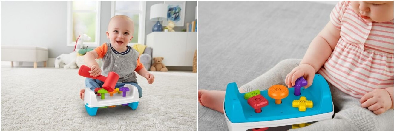 Maluchy mogą przekręcać kolorowe elementy, pociągać za nie i uderzać w nie – zabawa może trwać całymi godzinami! Dwustronny warsztacik ma kolorowe elementy o różnych kształtach, które mali majsterkowicze mogą łapać, przekręcać i uderzać zabawkowym młoteczkiem (idealnie pasującym do malutkiej rączki).