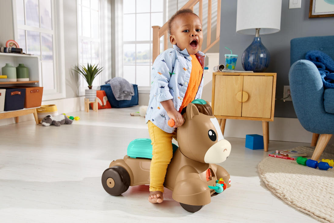 Muzyczny kucyk od FISHER PRICE do pchania i jeżdżenia „rośnie” wraz z dzieckiem, a mięciutkie sprężyste siedzenie oraz światełka i dźwięki zachęcają je do poruszania się. Gdy maluch naciska przyciski lub obraca wałeczkiem, słyszy wesołe piosenki i wypowiedzi, w tym o kolorach, literkach, liczeniu od 1 do 10.
