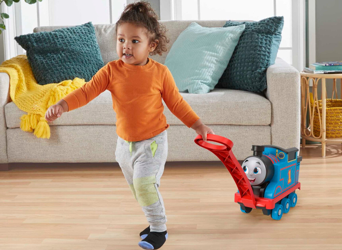 Z tym dużym Tomkiem do ciągnięcia miłośnicy kolei mogą odtwarzać przygody znane z bajki „Tomek i Przyjaciele”. Gdy dzieci będą potrzebowały przerwy od zabawy w ciągniecie lokomotywy, uchwyt można złożyć pod spód zabawki. Zabawka ma również wygodne miejsce do przechowywania, do którego można załadować „towary”.