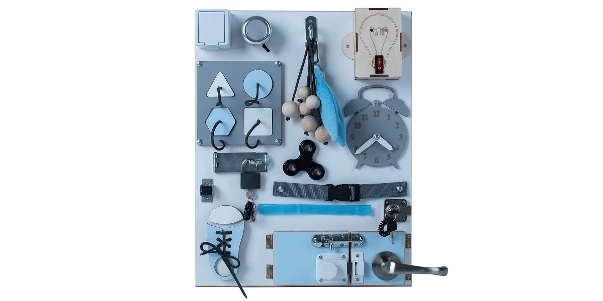 Tablica manipulacyjna MANIBOX Żarówka (50 x 39 cm) Niebieski, na której znajdują się 23 elementy przymocowane do drewnianej planszy. Każdy z nich nie tylko zapewni dziecku zabawę na długie godziny, ale i w niewymuszony sposób pobudzi wyobraźnię i ciekawość każdego maluszka.