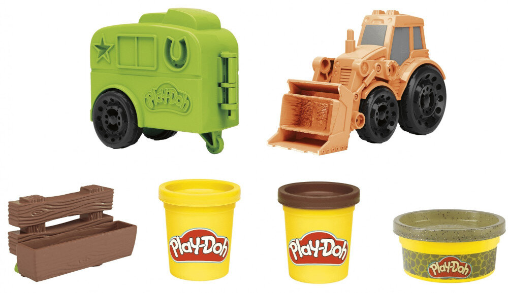 Czas wziąć się do roboty i przygotować bele siana! Segment Play-Doh wkracza na farmę, rozpoczynając świetną zabawę z traktorem oraz przyczepą. Uformuj ciastolinowe konie za pomocą przyczepki i bele siana przy pomocy traktora! Stwórz akcesoria takie jak podkowy, kukurydze czy marchewki i zobacz ile przygód na Ciebie czeka!