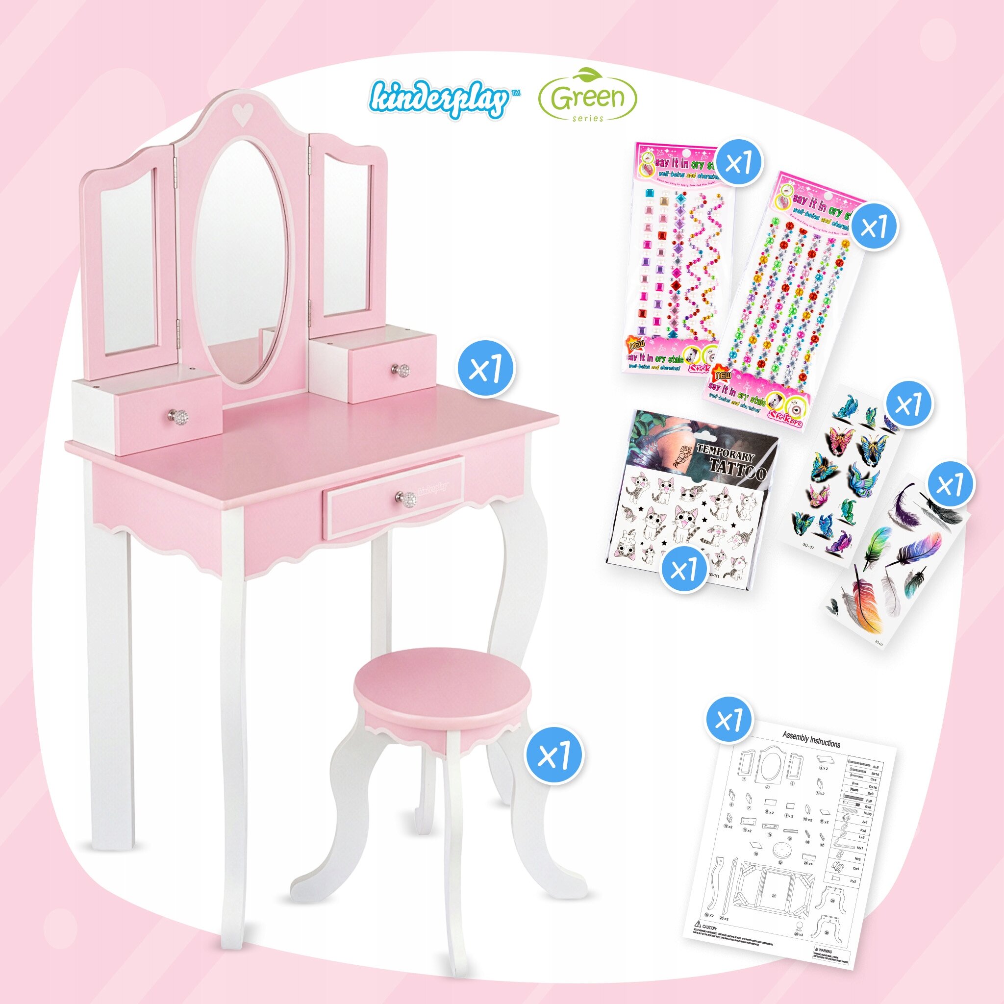 DREWNIANA TOALETKA DLA DZIEWCZYNKI Z LUSTREM I TABORETEM + NAKLEJKI - KINDERPLAY GREEN GS3303