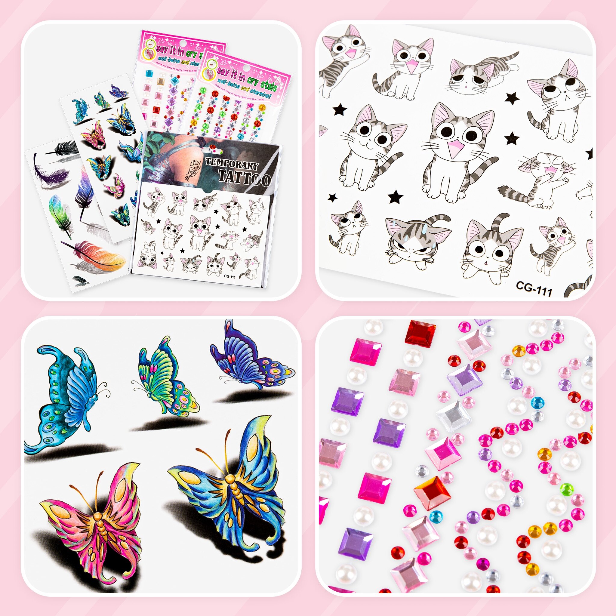 - 3 zestawy zmywalnych tatuaży (motylki, kotki, piórka)