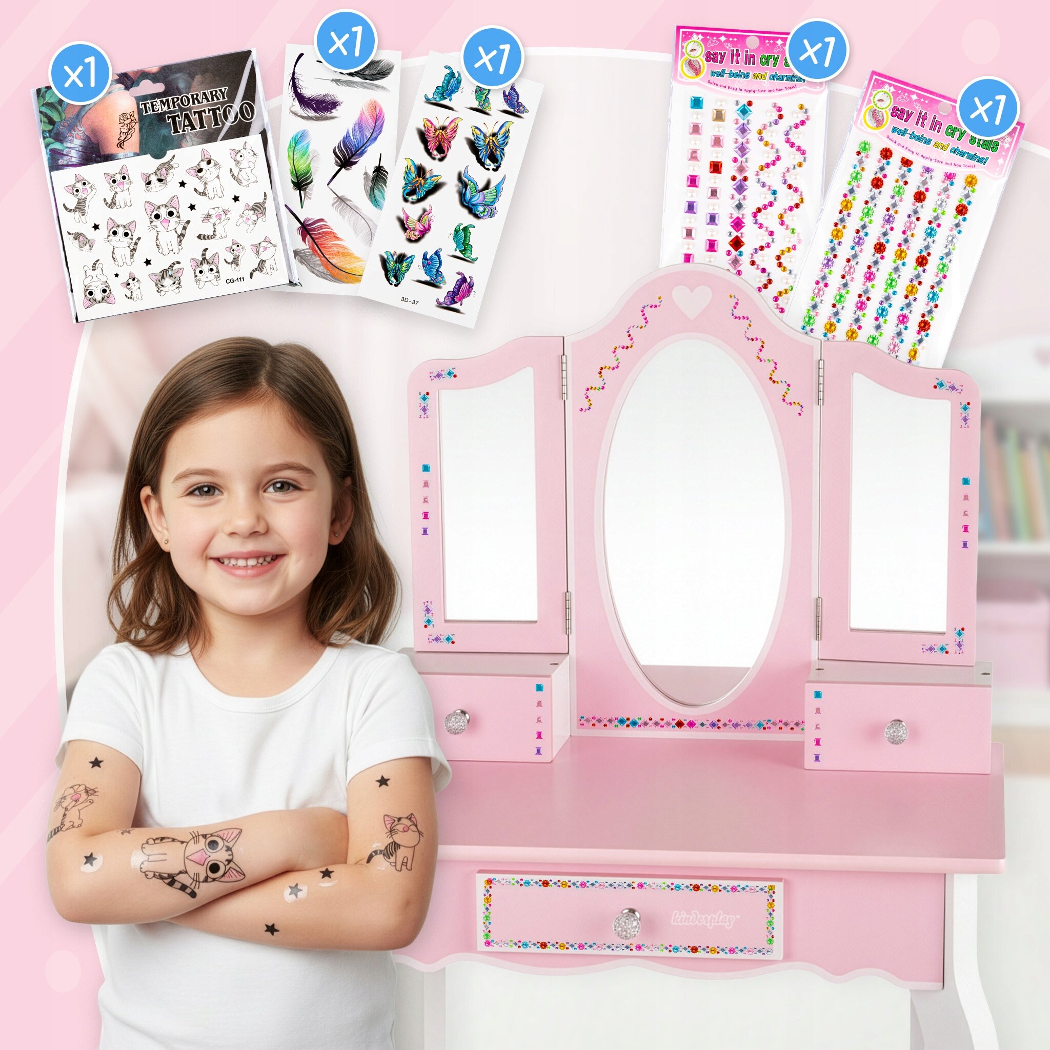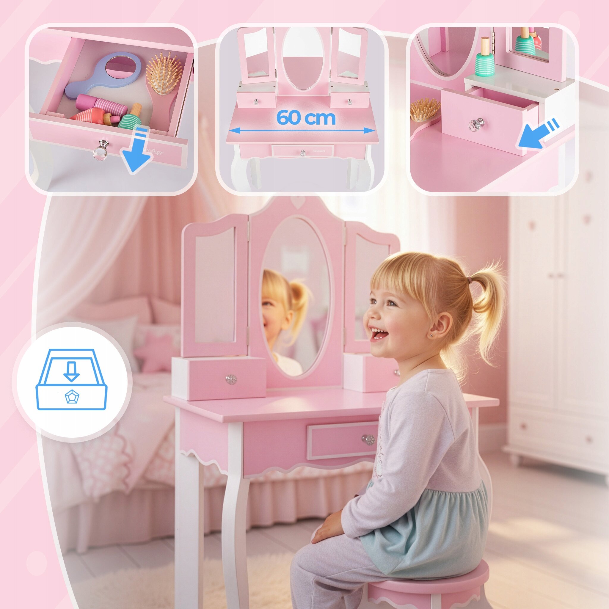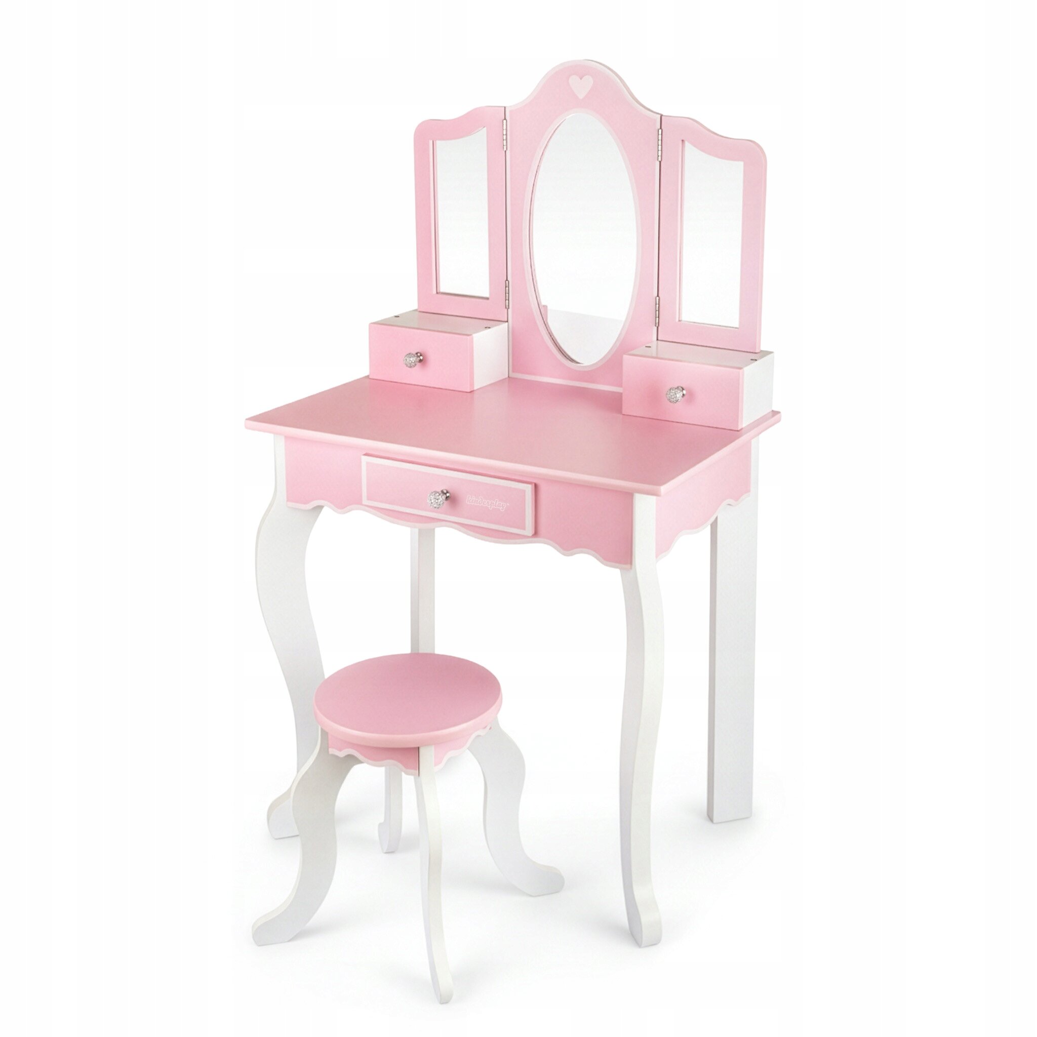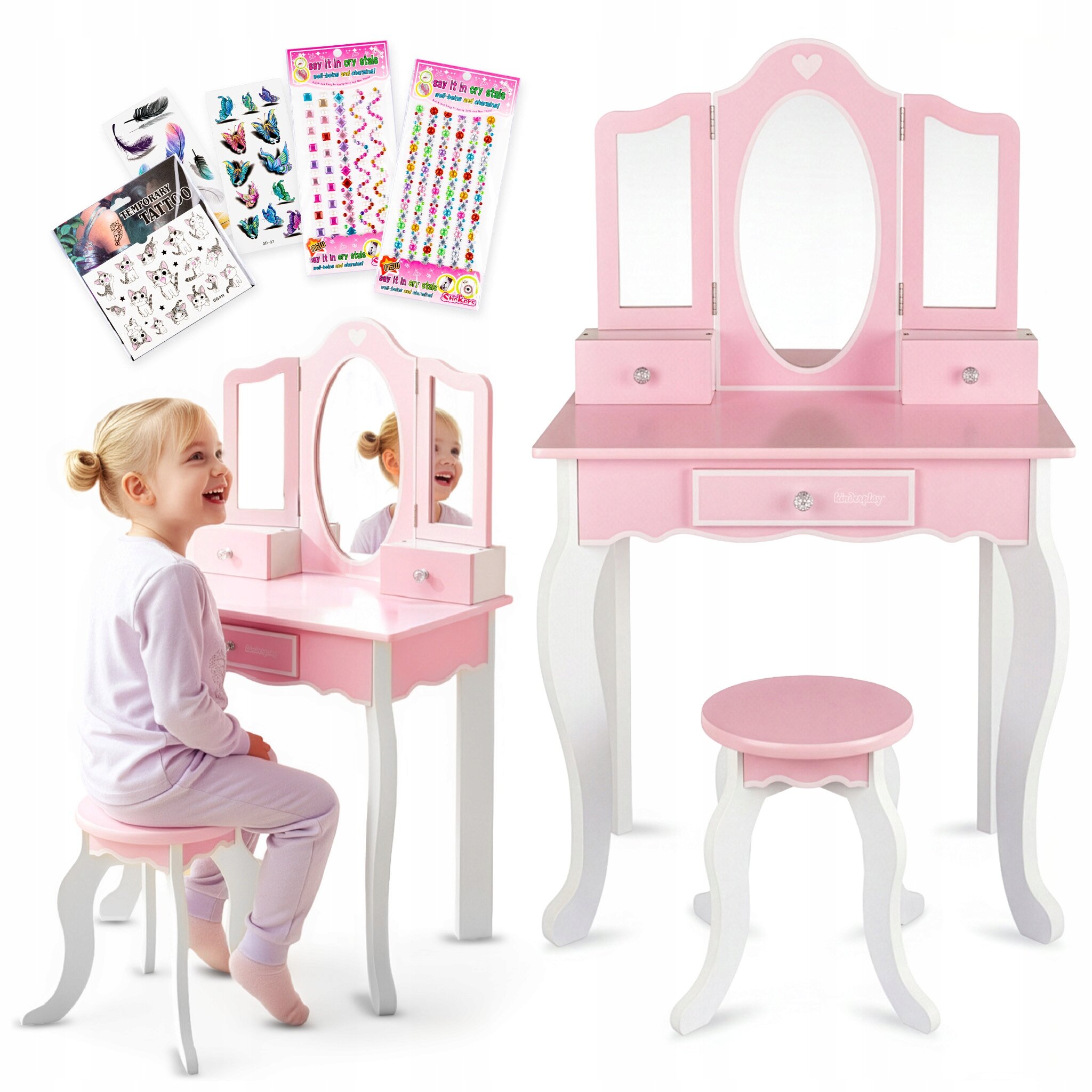 Odkryj uroczą, drewnianą toaletkę w kolorze różowym, zaprojektowaną dla małych elegantek. Zestaw zawiera trzy bezpieczne lustra wykonane z nietłukącego plexi oraz wygodny, stabilny taboret. Trzy funkcjonalne szuflady pomieszczą dziecięce skarby, a szeroki na 60 cm blat zapewni komfortową przestrzeń do zabawy. W komplecie znajdują się również naklejki i zmywalne tatuaże.