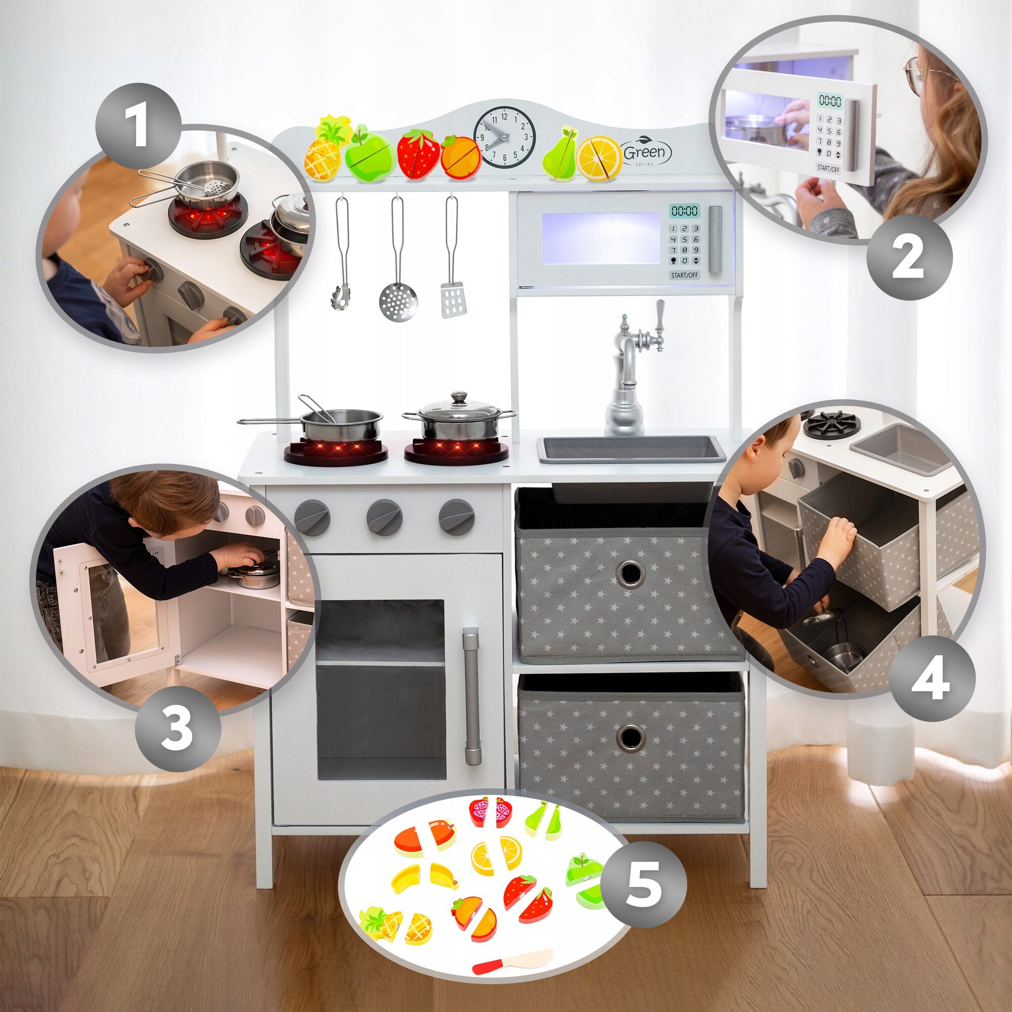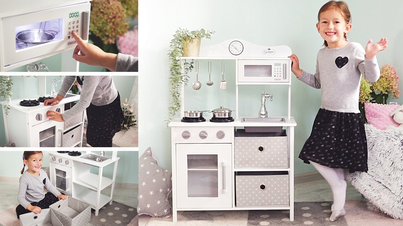 Kuchnia w stylu vintage z serii Green to propozycja ciekawej i angażującej zabawy dla dzieci, które chętnie naśladują dorosłych w codziennych obowiązkach. W bezpieczny sposób mogą bawić się w małych kucharzy, rozwijając przy tym umiejętności społeczne i współpracę.