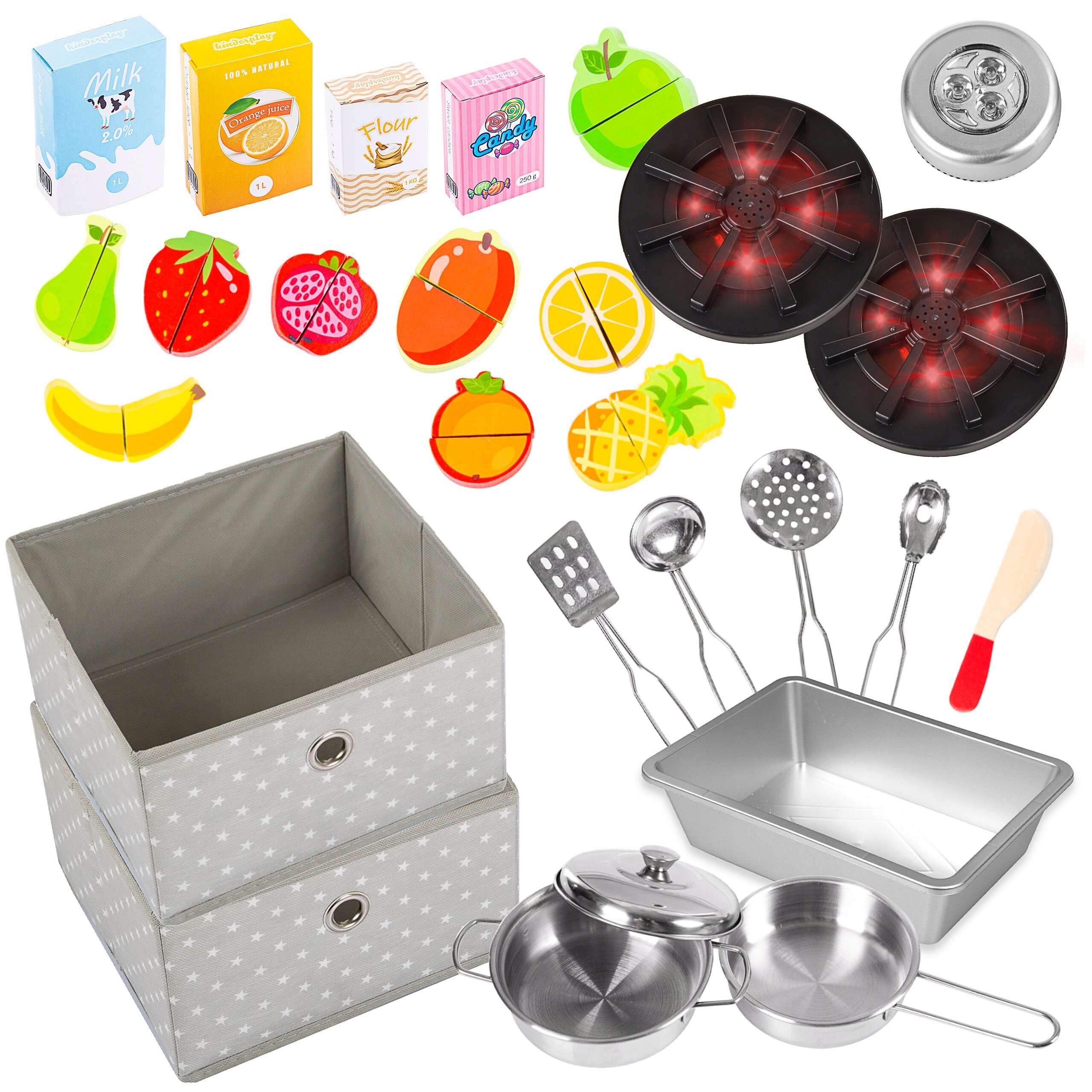 W zestawie znajdują się: garnek, przykrywka, patelnia, chochla, szumówka, łopatka pełna, łopatka z dziurkami, dwa kosze, dwa palniki, kran, zlew, oświetlenie LED, dziewięć owoców, drewniany nóż oraz cztery kartonowe produkty.
