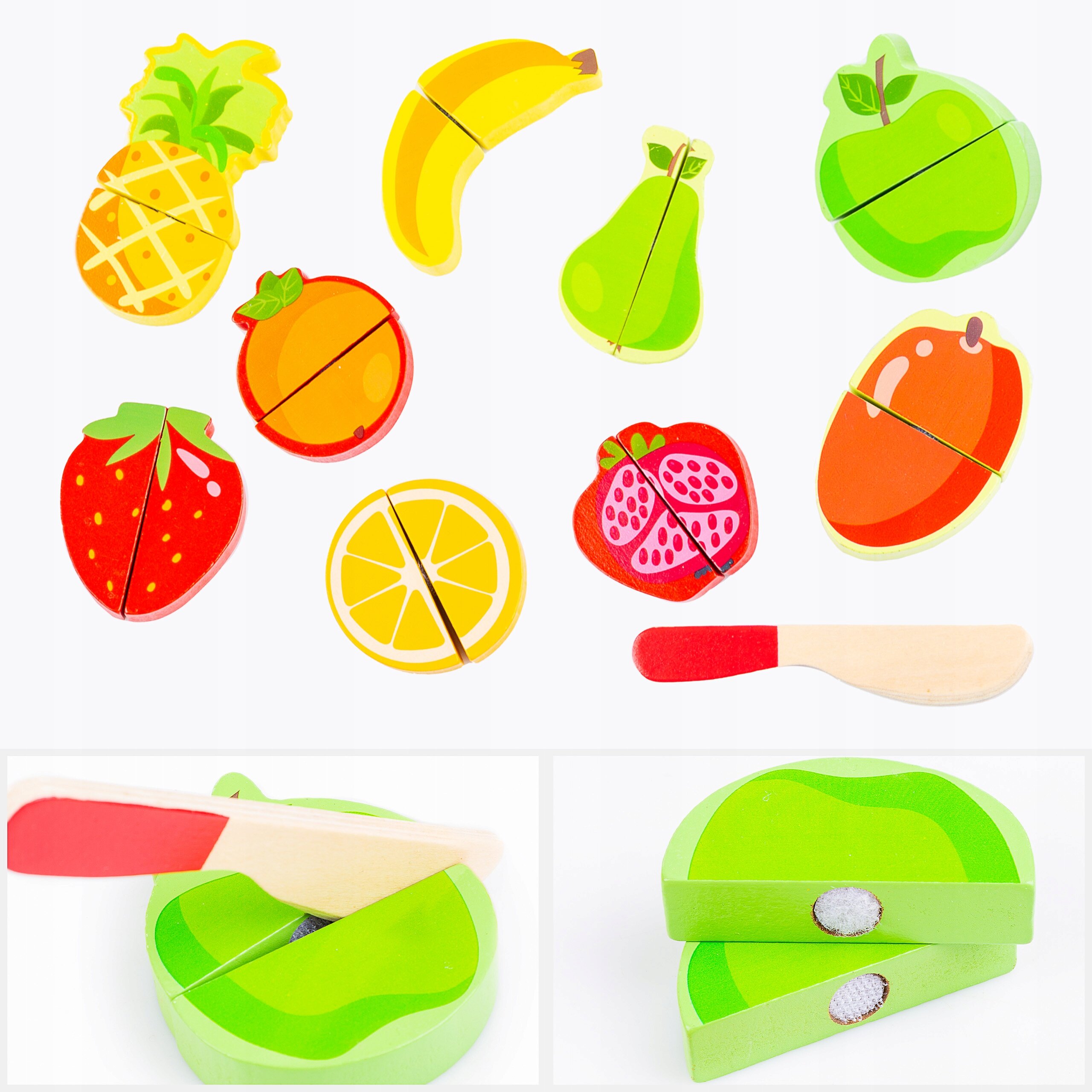 Dzięki drewnianym owocom dziecko nauczy się nazw i rozpoznawania popularnych produktów spożywczych. Wszystkie elementy są pokryte bezpieczną dla dzieci farbą.