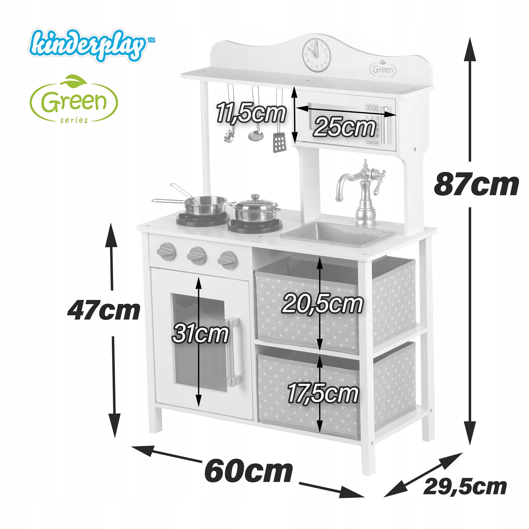 Zestaw zachęca do rozwijania umiejętności motorycznych, koordynacji, wyobraźni i kreatywnego rozwiązywania problemów. Kuchnia jest przyjemna w dotyku i bezpieczna w użytkowaniu. Wykonana została z drewna, a drobne elementy, takie jak uchwyty, z plastiku.