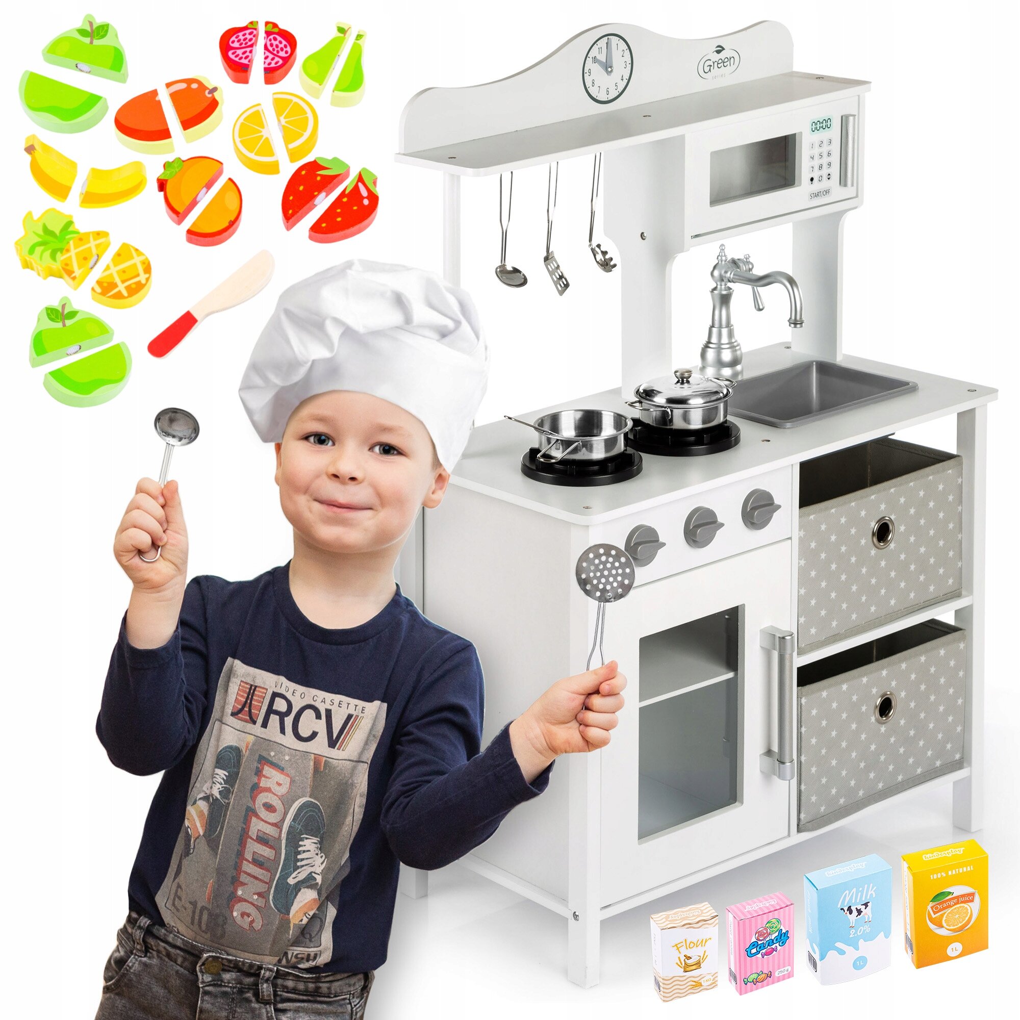 Zestaw rozwija zdolności manualne, koordynację i wyobraźnię dziecka. Kuchnia jest wykonana z drewna, przyjemna w dotyku i pozbawiona ostrych krawędzi. Drobne elementy, jak kran czy zlew, wykonano z plastiku.