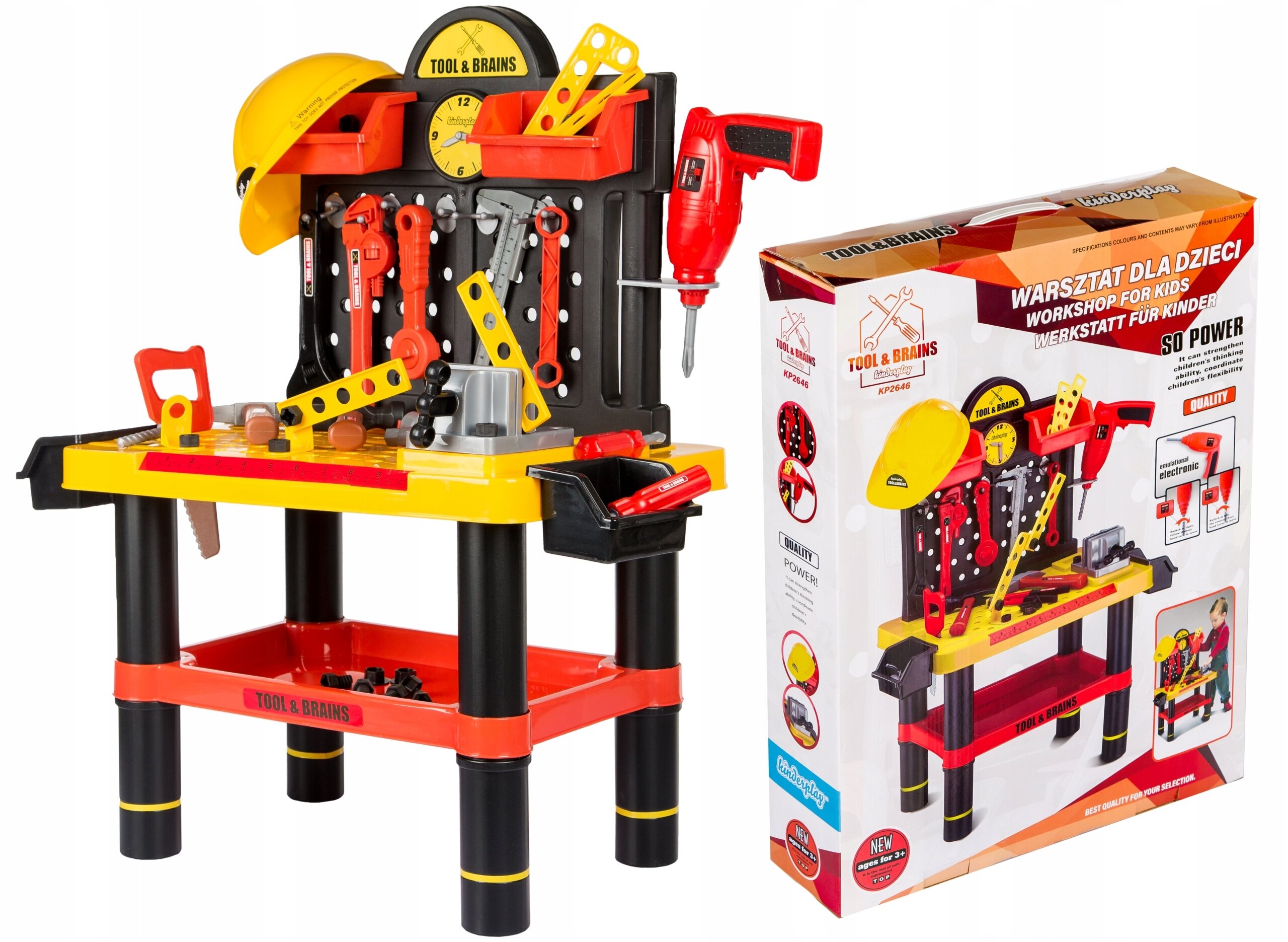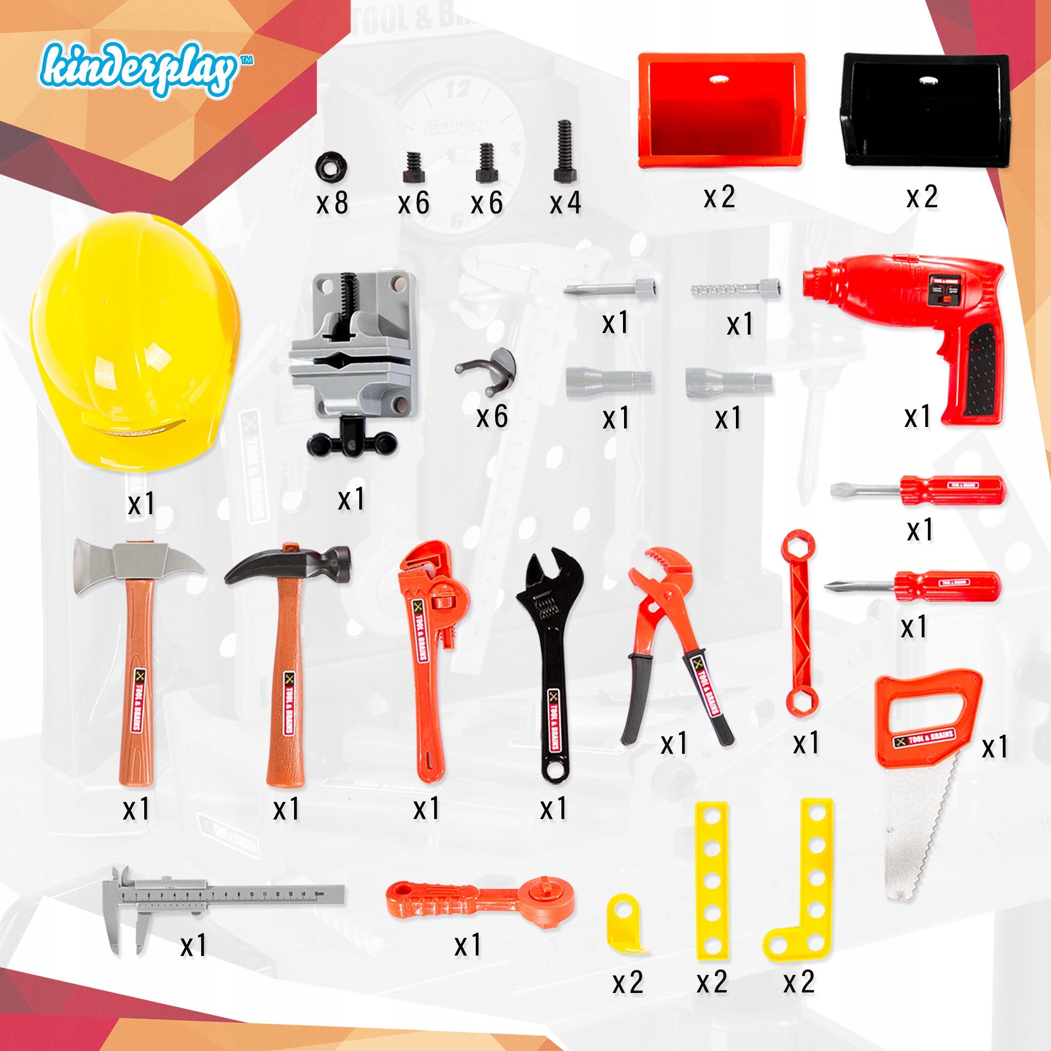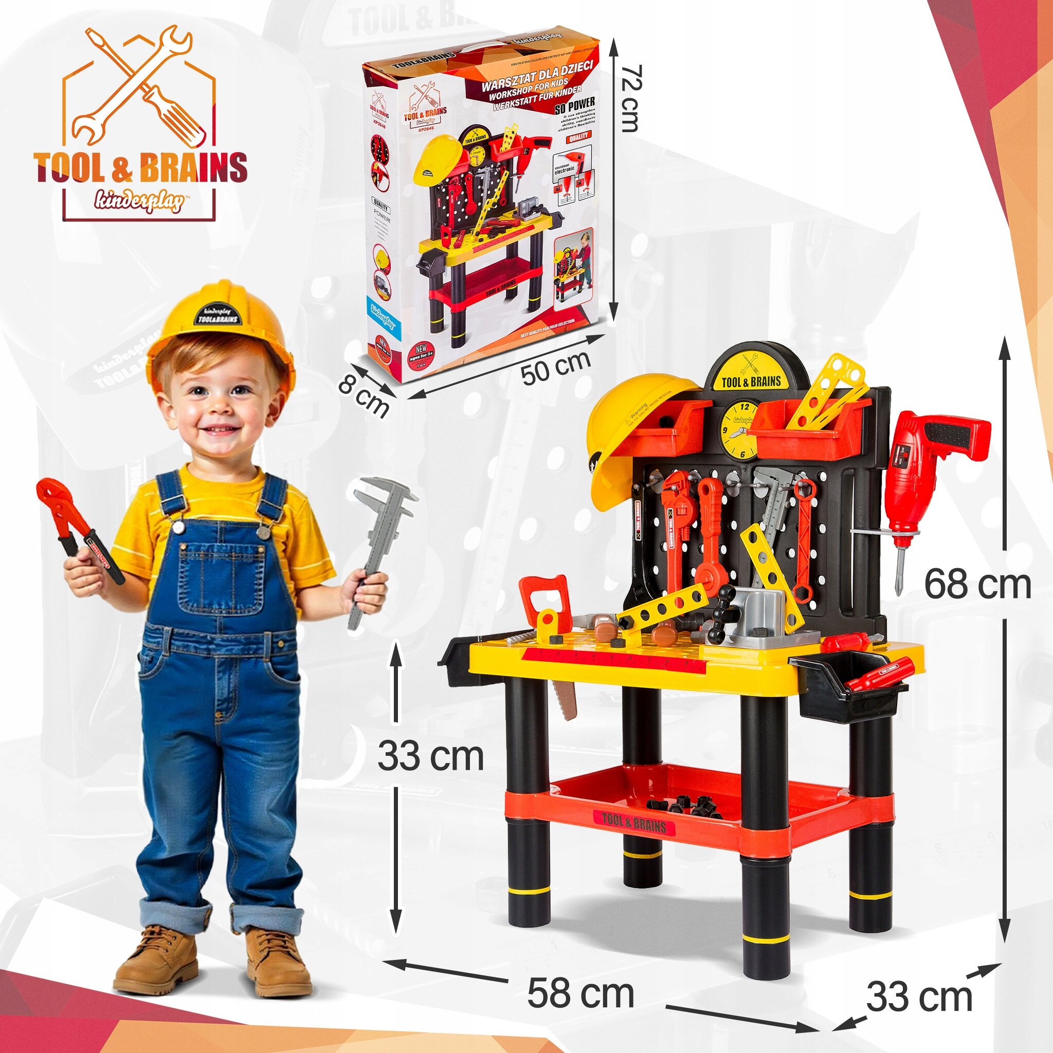 Odkryj świat kreatywnej zabawy z kompletnym warsztatem Tool & Brains od Kinderplay! Ten wyjątkowy zestaw zawiera wszystko, czego potrzebuje mały majsterkowicz, aby rozwijać swoją pasję i zdolności manualne. Wyróżnia go bogate wyposażenie – ponad 50 elementów, realistyczna wiertarka na baterie oraz kask bezpieczeństwa, który dodaje zabawie realizmu i uczy dobrych nawyków już od najmłodszych lat.
