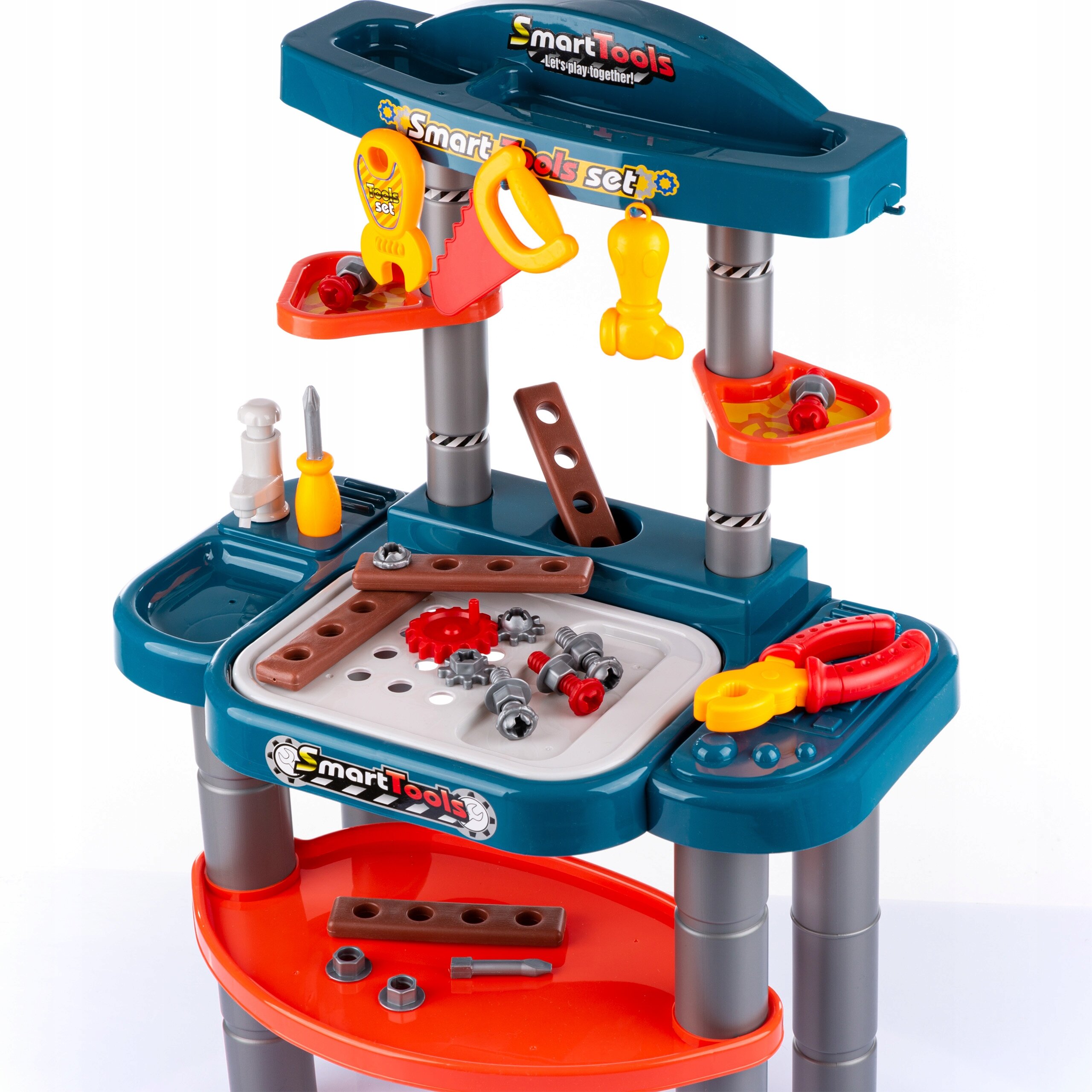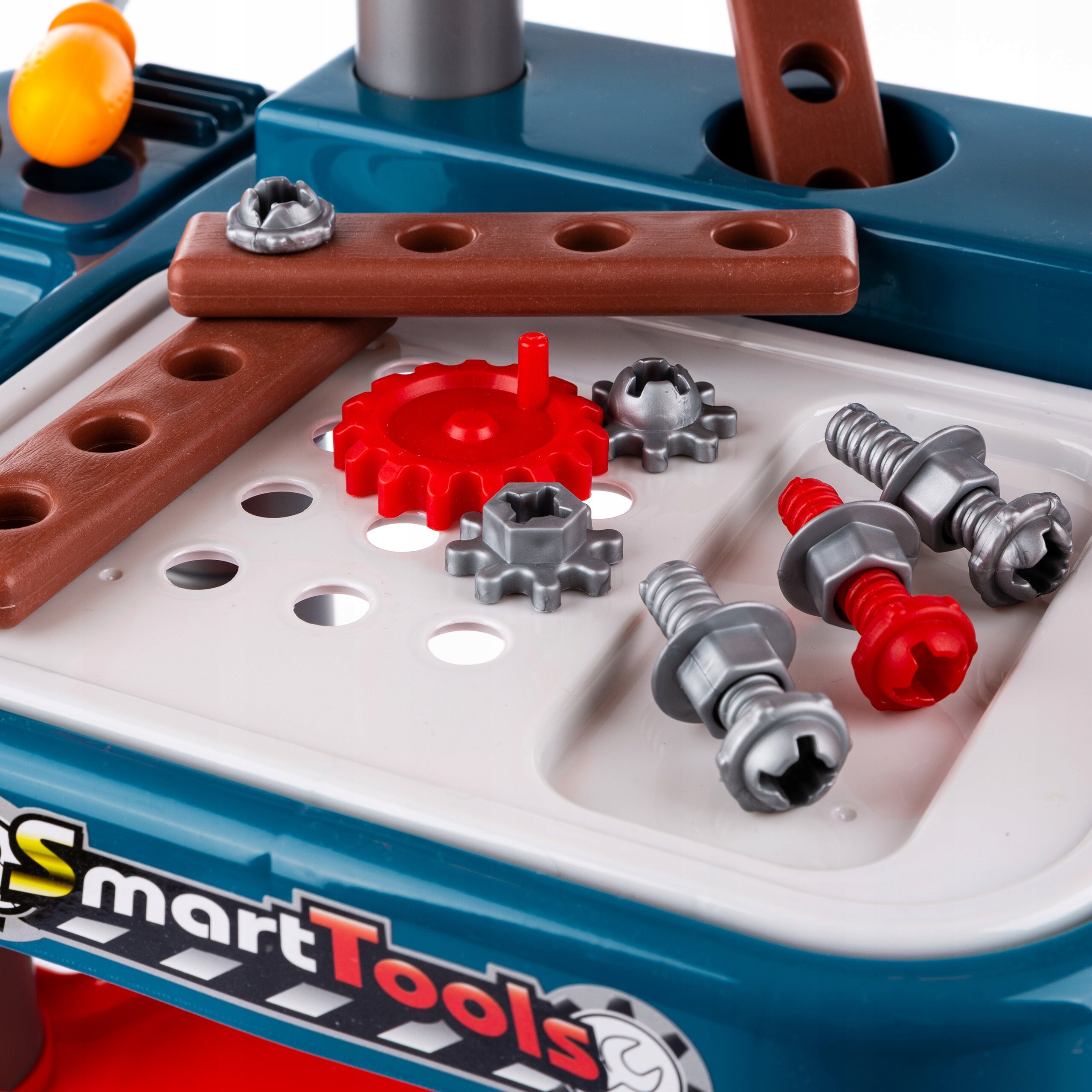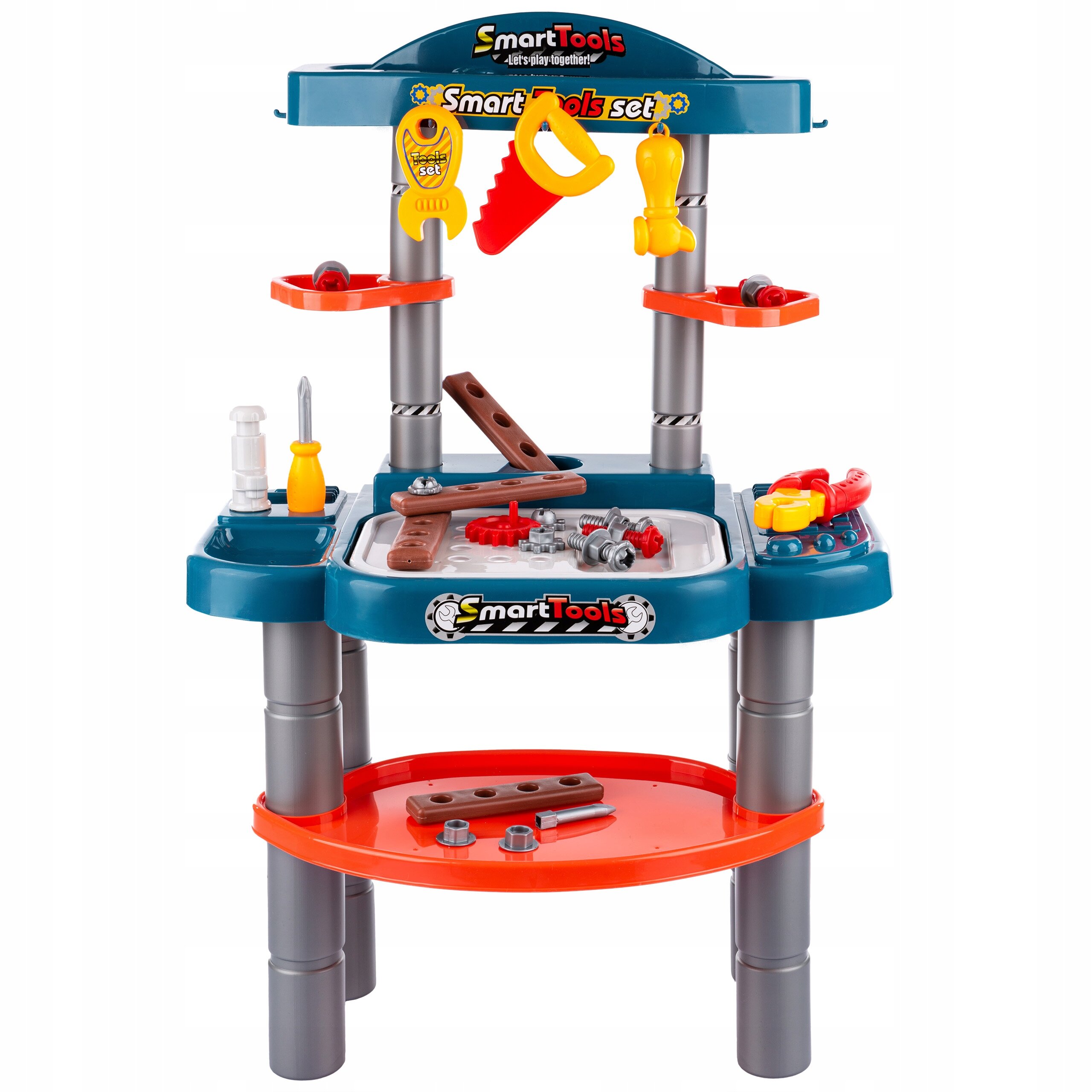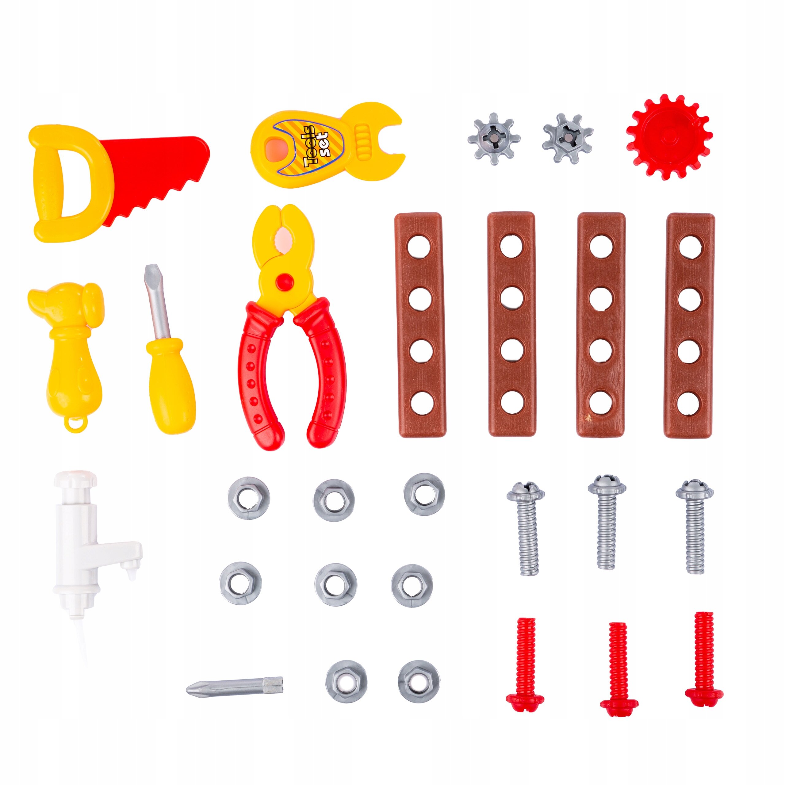W zestawie z warsztatem znajdują się: piła, klucz, kombinerki, śrubokręt, młotek oraz inne akcesoria, takie jak śrubki, nakrętki czy imitacje elementów drewnianych do skręcania.