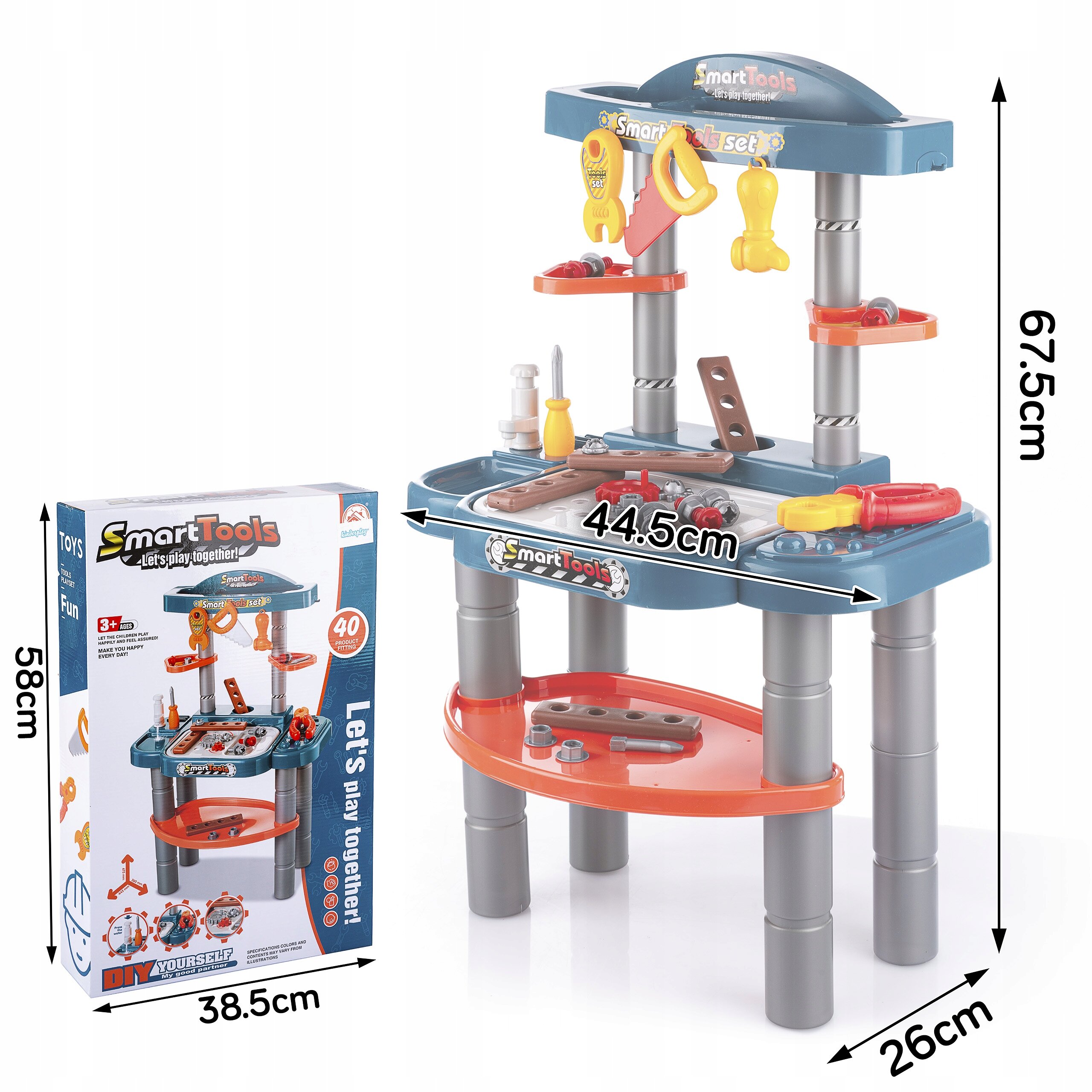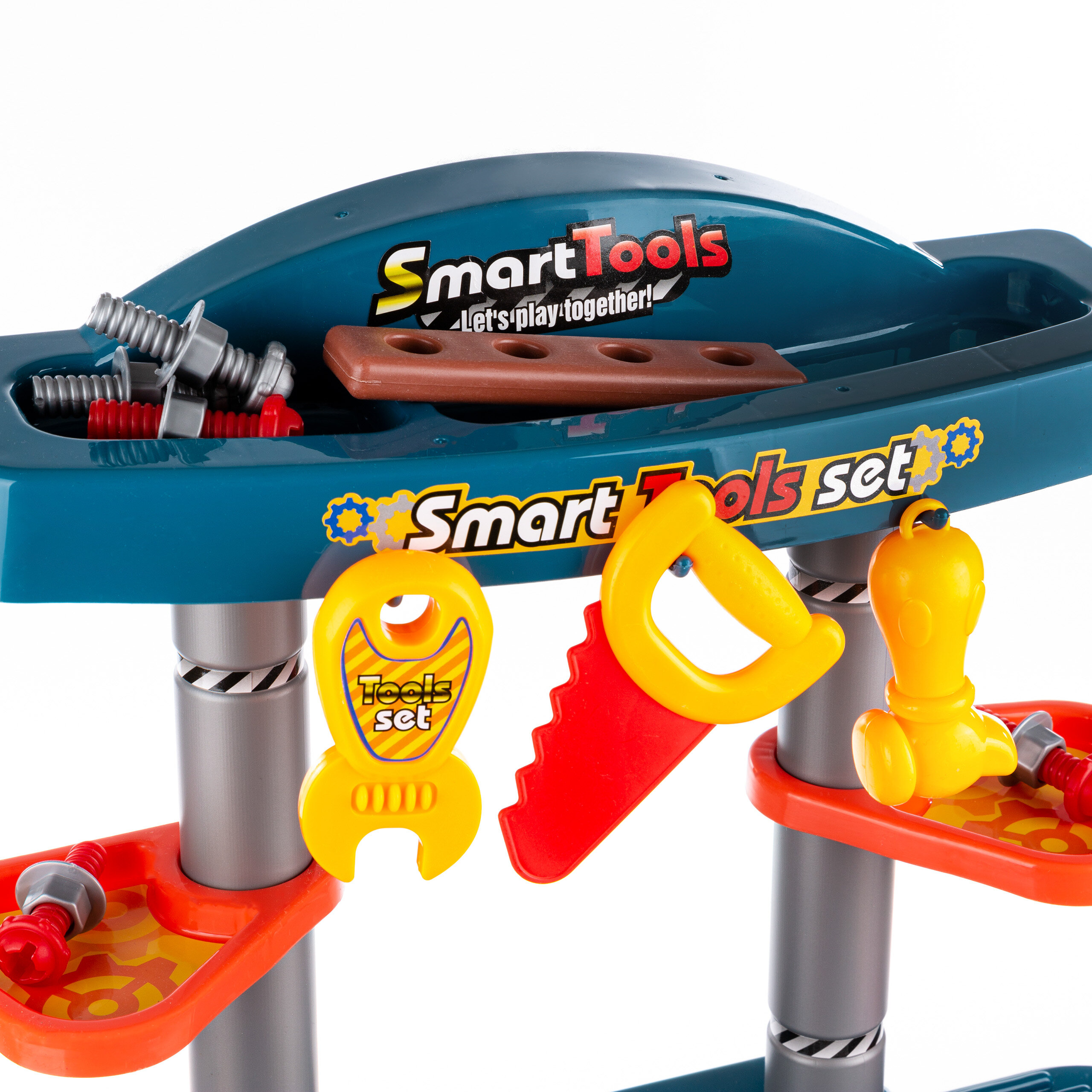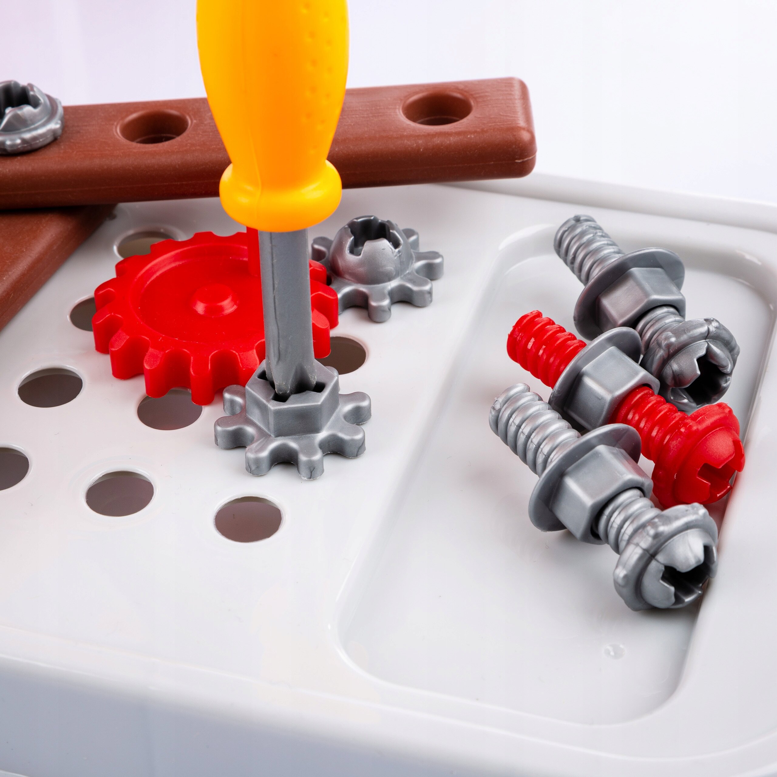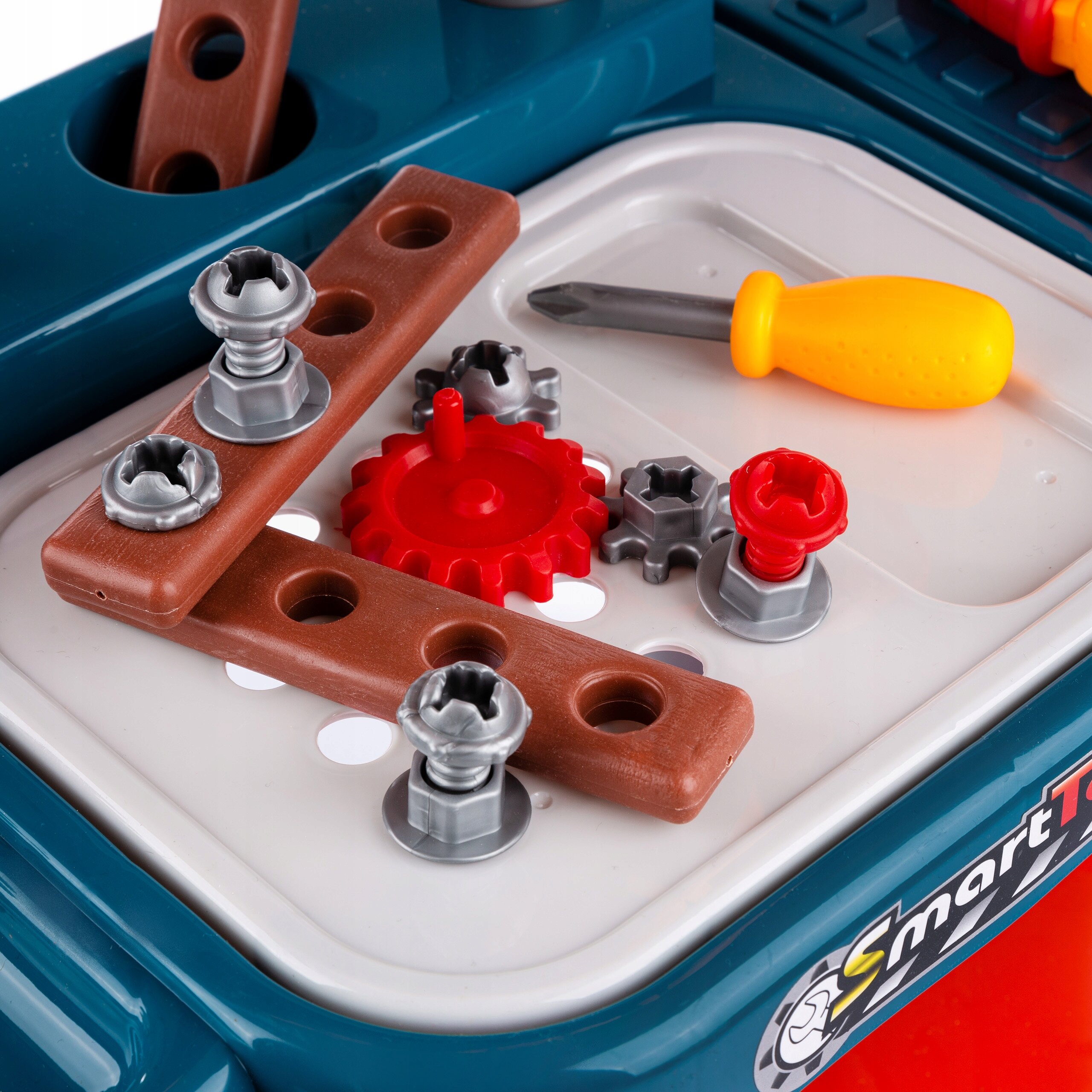W zestawie z warsztatem znajdują się: piła, klucz, kombinerki, śrubokręt, młotek oraz inne akcesoria, takie jak śrubki, nakrętki czy imitacje elementów drewnianych do skręcania.