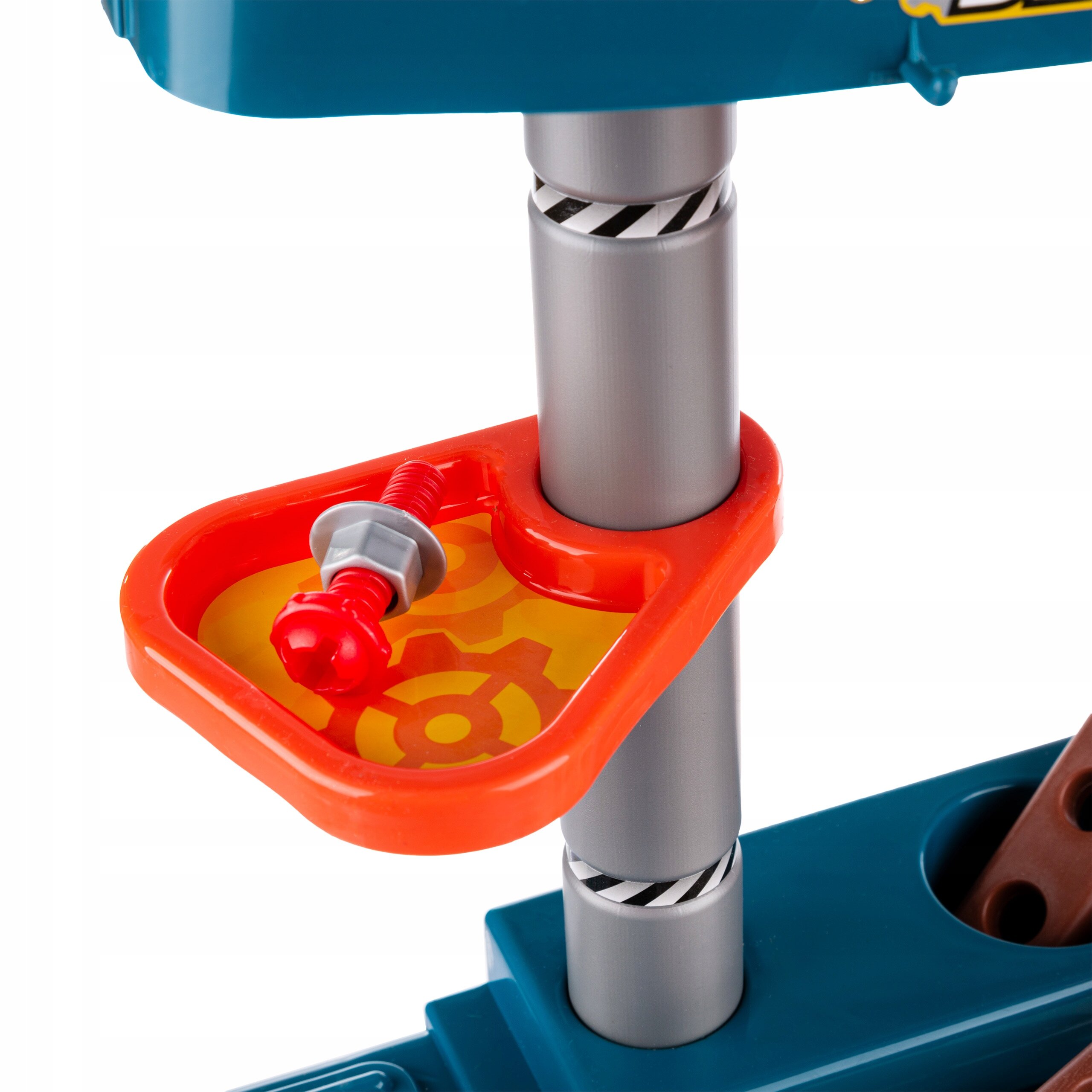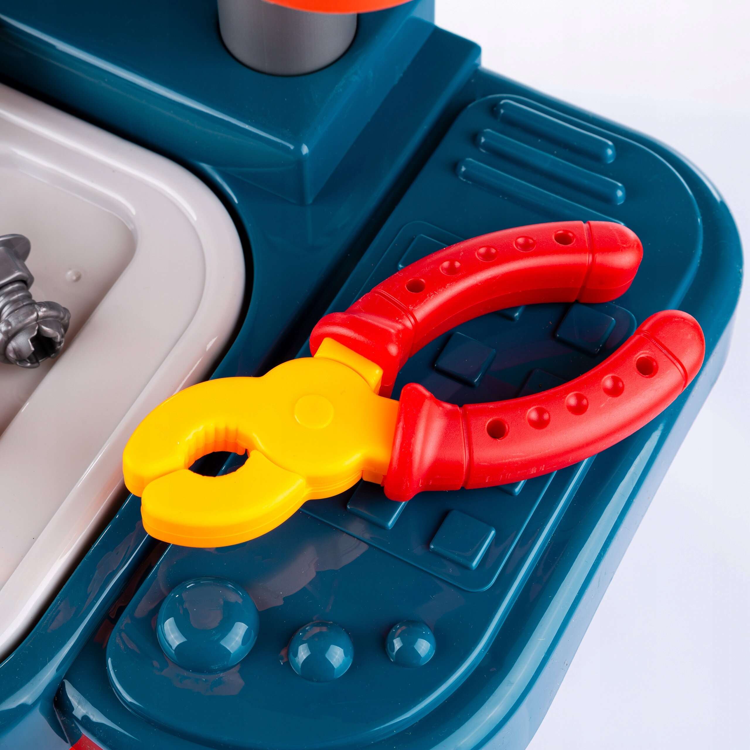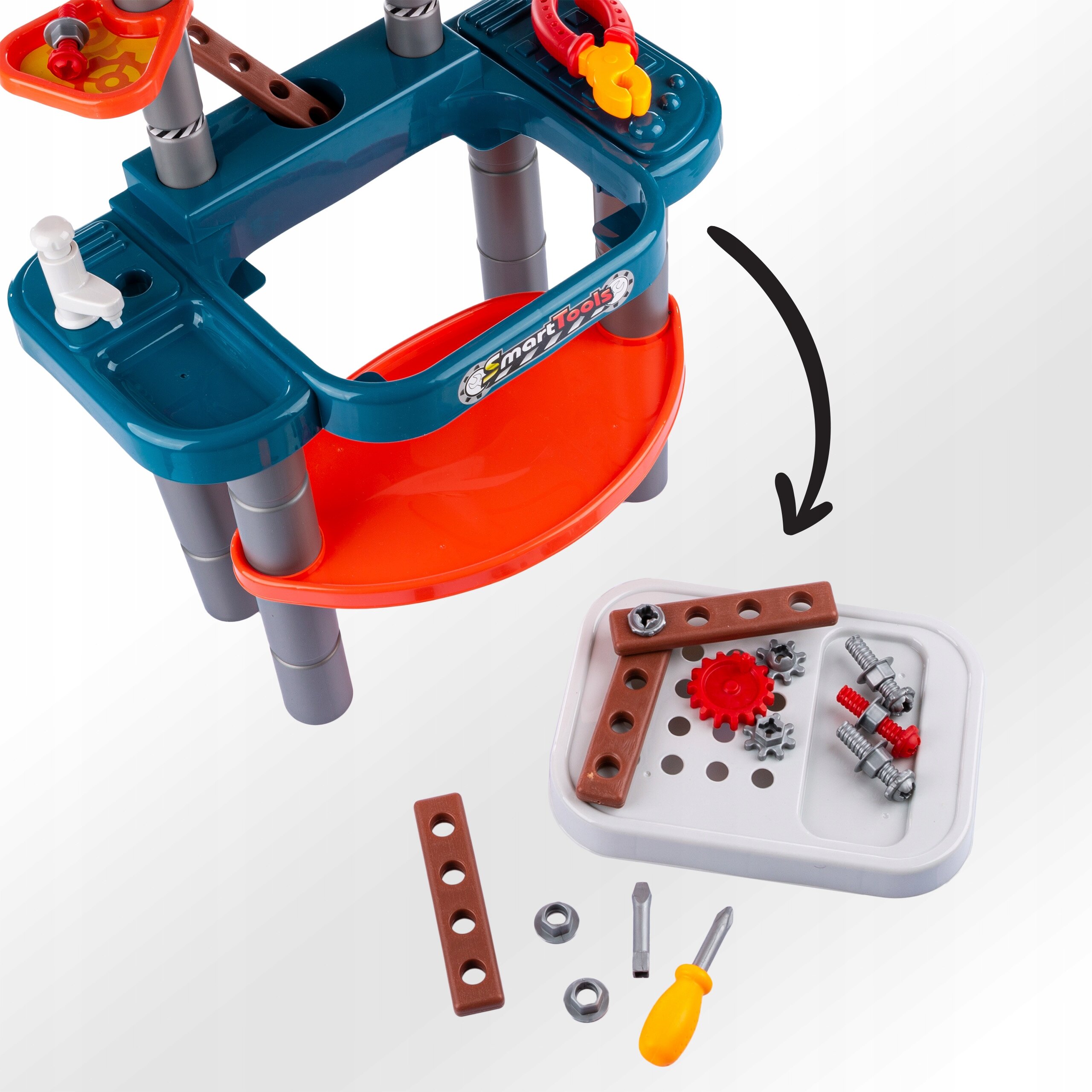 Blat warsztatu można łatwo wyjąć, dzięki czemu zabawę można przenieść na podłogę lub w inne miejsce, gdzie dziecko lubi majsterkować.