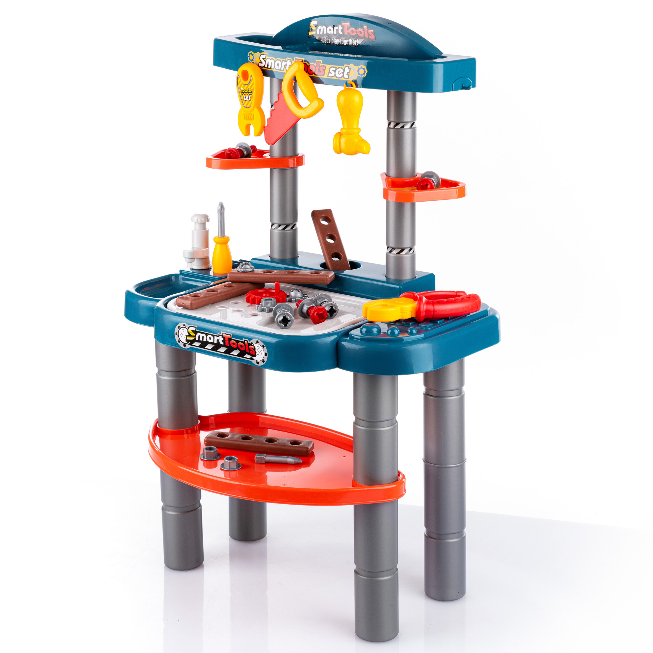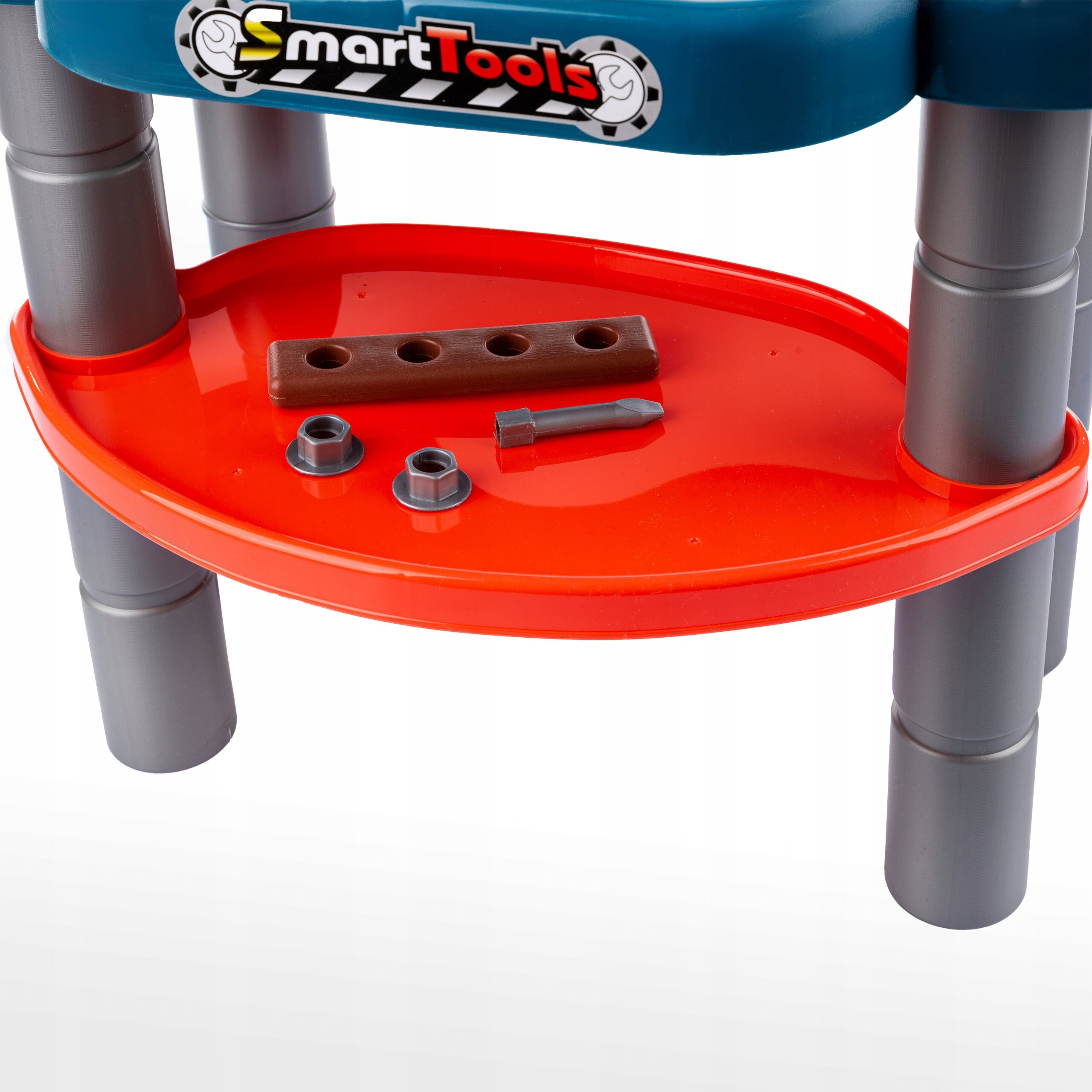 Warsztat posiada specjalne miejsca do przechowywania narzędzi oraz innych zabawek dziecka.